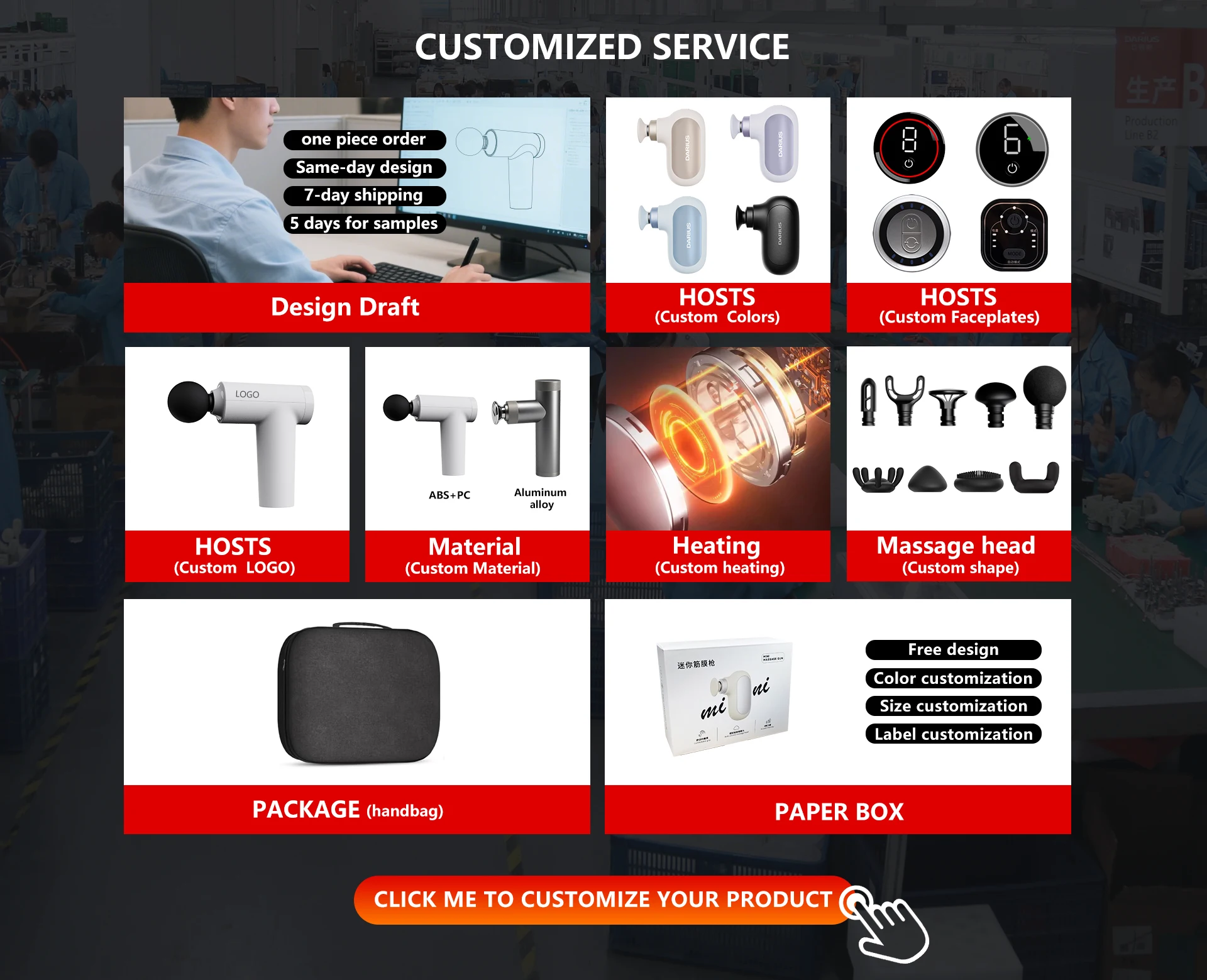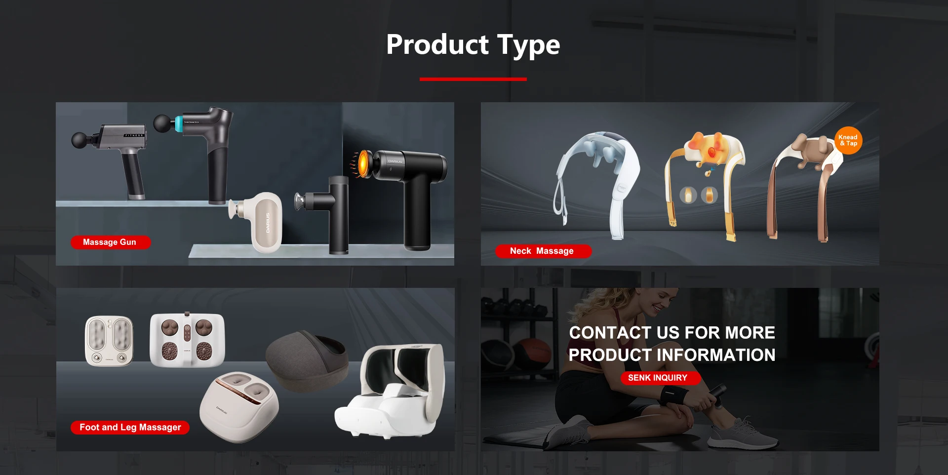 Productos principales:Masajeador de cuello, pistola de masaje, masajeador de pies, almohada de masaje, colchón de masaje